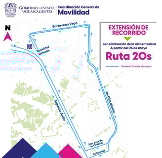 ¡Atención, usuarios del transporte público en Aguascalientes! Tenemos excelentes noticias para quienes acostumbran viajar en las rutas 20 Norte y 20 Sur. A partir del próximo domingo 26 de mayo, estas rutas ampliarán su recorrido habitual para brindarles un servicio más completo. ¿Qué cambios podrán esperar? Pues bien, además de circular por el Primer Anillo y la avenida Nazario Ortiz Garza como hasta ahora, las rutas 20 Norte y 20 Sur también pasarán por las avenidas Miguel Ángel Barberena, Ojocaliente y Segundo Anillo. ¡Más opciones para llegar a su destino! Pero eso no es todo. Como parte de estos ajustes, la Ruta 20 Alimentadora dejará de operar a partir de esa misma fecha. Así que aquellos que la utilizaban, ya sea para desplazamientos regulares o para llegar a la Terminal YoVoy Barberena, deberán ahora abordar la 20 Norte o la 20 Sur, según el sentido de su viaje. ¿Y saben qué es lo mejor? Estos cambios fueron solicitados por ustedes mismos, los usuarios, con el objetivo de simplificar los recorridos y brindarles un servicio más eficiente. La Coordinación General de Movilidad (CMOV) escuchó sus peticiones y actuó en consecuencia. Así que prepárense para disfrutar de una experiencia de transporte público mejorada en Aguascalientes. Más rutas, más opciones y un servicio adaptado a sus necesidades. ¡El Gobierno del Estado trabaja para brindarles la mejor movilidad posible! ción de aves rapaces que los va a dejar con el ojo cuadrado. Así que ya saben, chamacos y chamacas, este domingo 28 de abril el parque Rodolfo Landeros es el lugar donde tienen que estar para celebrar su día. Vengan con sus jefes, sus abuelos, sus hermanos y sus amigos, porque va a haber un montón de aventuras, risas y momentos chingones que nunca van a olvidar.