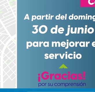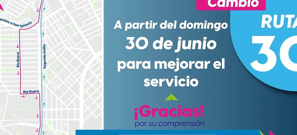 El Gobierno del Estado informa que a partir del domingo 30 de junio, la Ruta 30 cambiará su recorrido de manera permanente en el sentido de circulación de sur a norte, dejando de recorrer las calles del fraccionamiento Colinas del Río. La Coordinación General de Movilidad (CMOV) anuncia que esta modificación se realiza para mejorar el servicio a los pasajeros de esta ruta, haciendo el trayecto más directo y seguro, lo que reducirá el tiempo de recorrido. El resto del recorrido de la Ruta 30 en el sentido de sur a norte permanecerá sin cambios. Además, los camiones urbanos de la Ruta 30 que circulan de norte a sur seguirán ingresando al fraccionamiento Colinas del Río sin modificaciones.