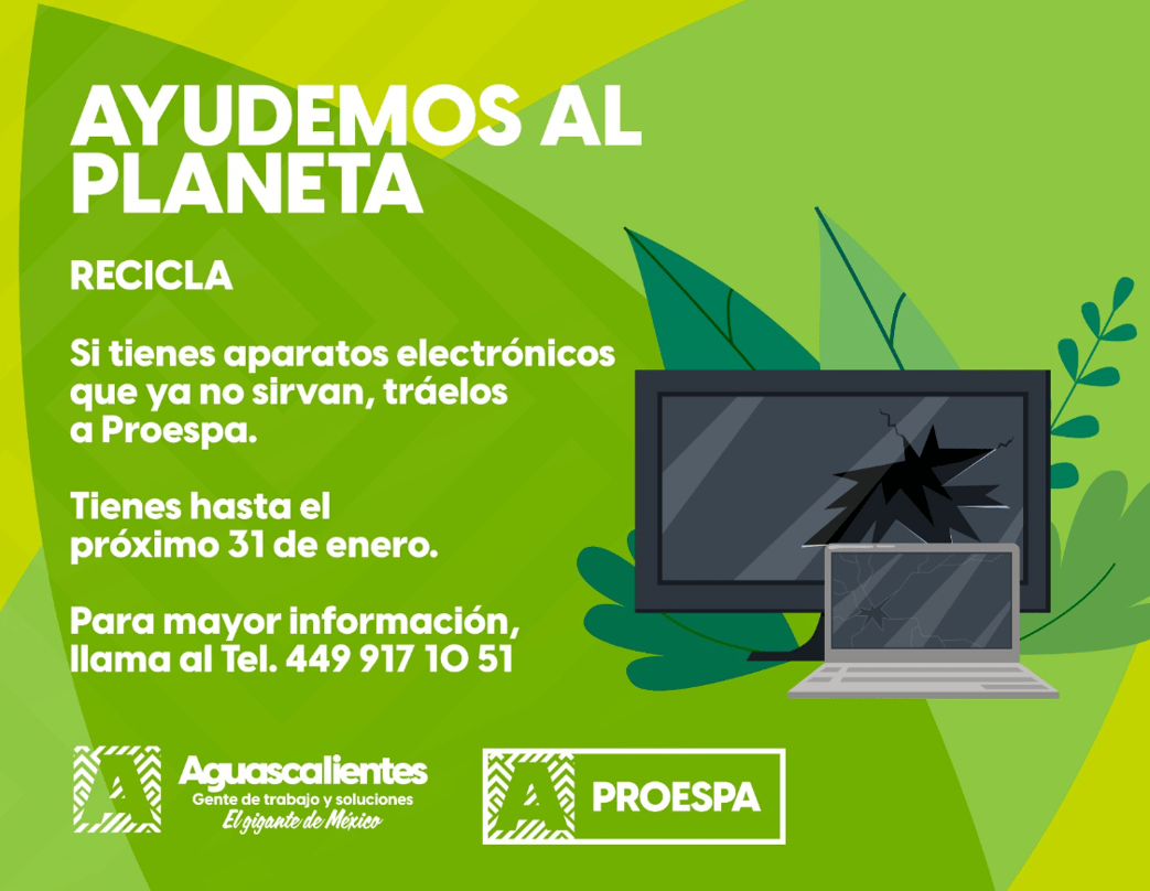 La Procuraduría Estatal de Protección al Ambiente (Proespa) ha lanzado una campaña de reciclaje de aparatos electrónicos, invitando a la población a llevar dispositivos que ya no utilicen o no sirvan a sus instalaciones antes del 31 de enero de 2024. Héctor Eduardo Anaya Pérez, titular de la Proespa, detalló que se recibirán una amplia gama de dispositivos, desde celulares hasta computadoras y televisores. Los aparatos serán recibidos en las oficinas de la Proespa, ubicadas en el Jardín del Encino No. 106 A, colonia Jardínes de Aguascalientes, de lunes a viernes, de 8:00 a 16:00 horas. Esta iniciativa busca fomentar el reciclaje de dispositivos electrónicos para asegurar su adecuado manejo y tratamiento, evitando así daños al medio ambiente. Para más información, se pueden comunicar al teléfono 449 917 10 51.