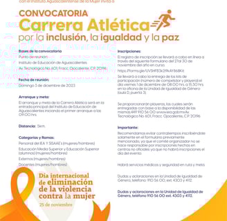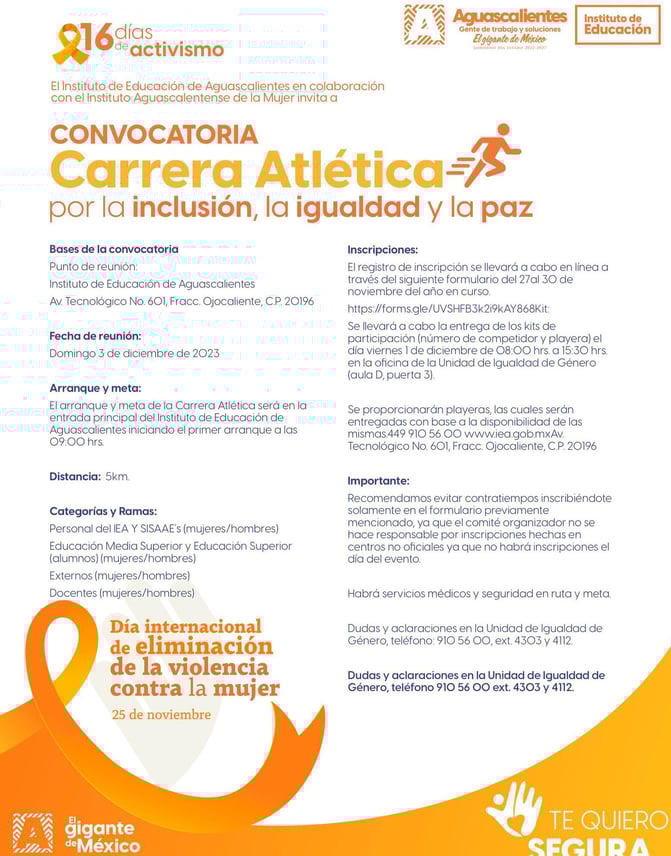 ¡Prepárate para un evento que va más allá de la competencia! Este domingo 3 de diciembre, a las 9 am, únete a la Carrera Atlética por la Inclusión, la Igualdad y la Paz, donde cada zancada marca un paso hacia un mundo más justo y equitativo. El punto de partida será el inspirador Bosque Urbano, situado en la intersección de las Avenidas Gómez Morín y Gabriela Mistral. Corredores de todas las edades y habilidades están invitados a participar en esta celebración de diversidad y solidaridad. Más que una carrera, es una oportunidad para promover valores fundamentales y generar conciencia sobre la importancia de la inclusión y la paz en nuestras comunidades. ¡Únete a nosotros mientras cruzamos la línea de meta hacia un futuro más brillante y esperanzador para todos!