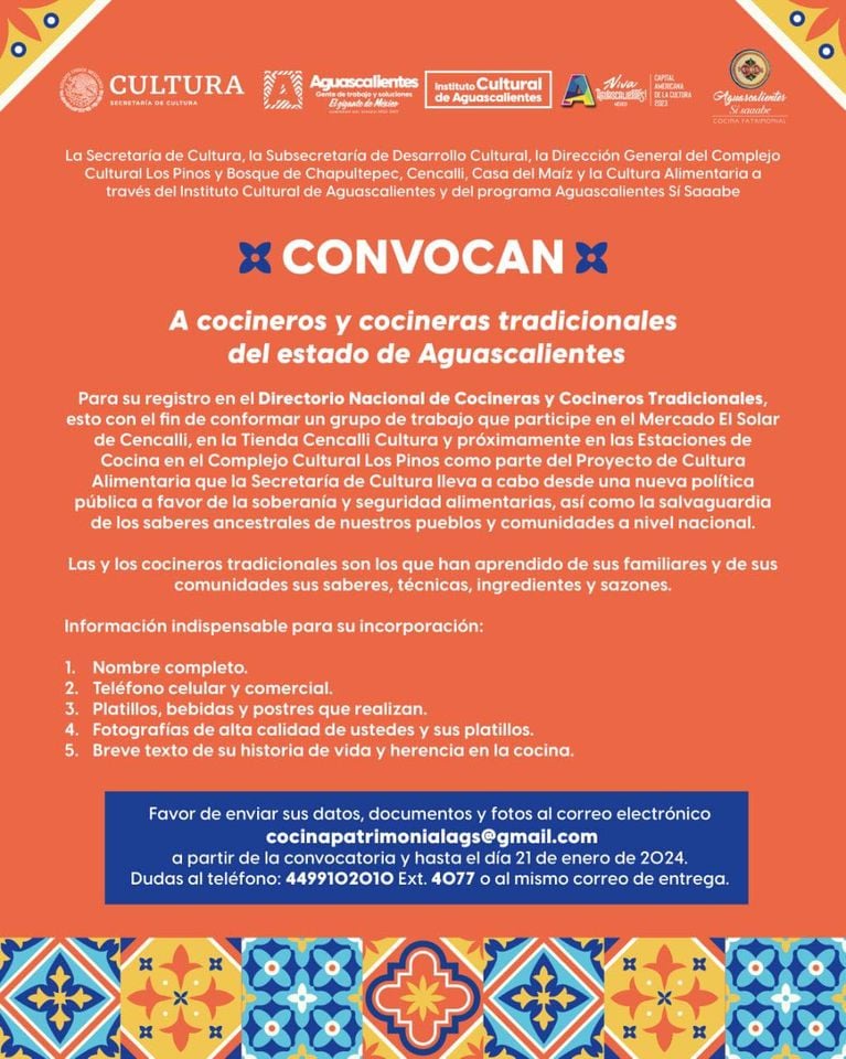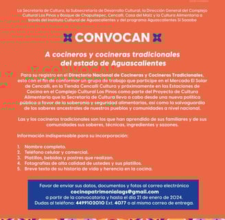 ¡Únete a la tradición culinaria y sé parte del Directorio Estatal de Cocineras y Cocineros Tradicionales en Aguascalientes! En un año lleno de éxitos, el Programa Aguascalientes Sí Saaabe evoluciona y te invita a formar parte de este proyecto único. Convocamos a cocineras y cocineros tradicionales a postularse para integrar el primer Directorio Estatal, participando en actividades a nivel federal durante el próximo año. Consulta la imagen para obtener toda la información y ser parte de la riqueza gastronómica de nuestra región. ¡Tu cocina es parte esencial de nuestra cultura! #ViveICA #CapitalAmericanaDeLaCultura #AguascalientesSíSaaabe
