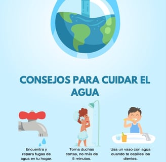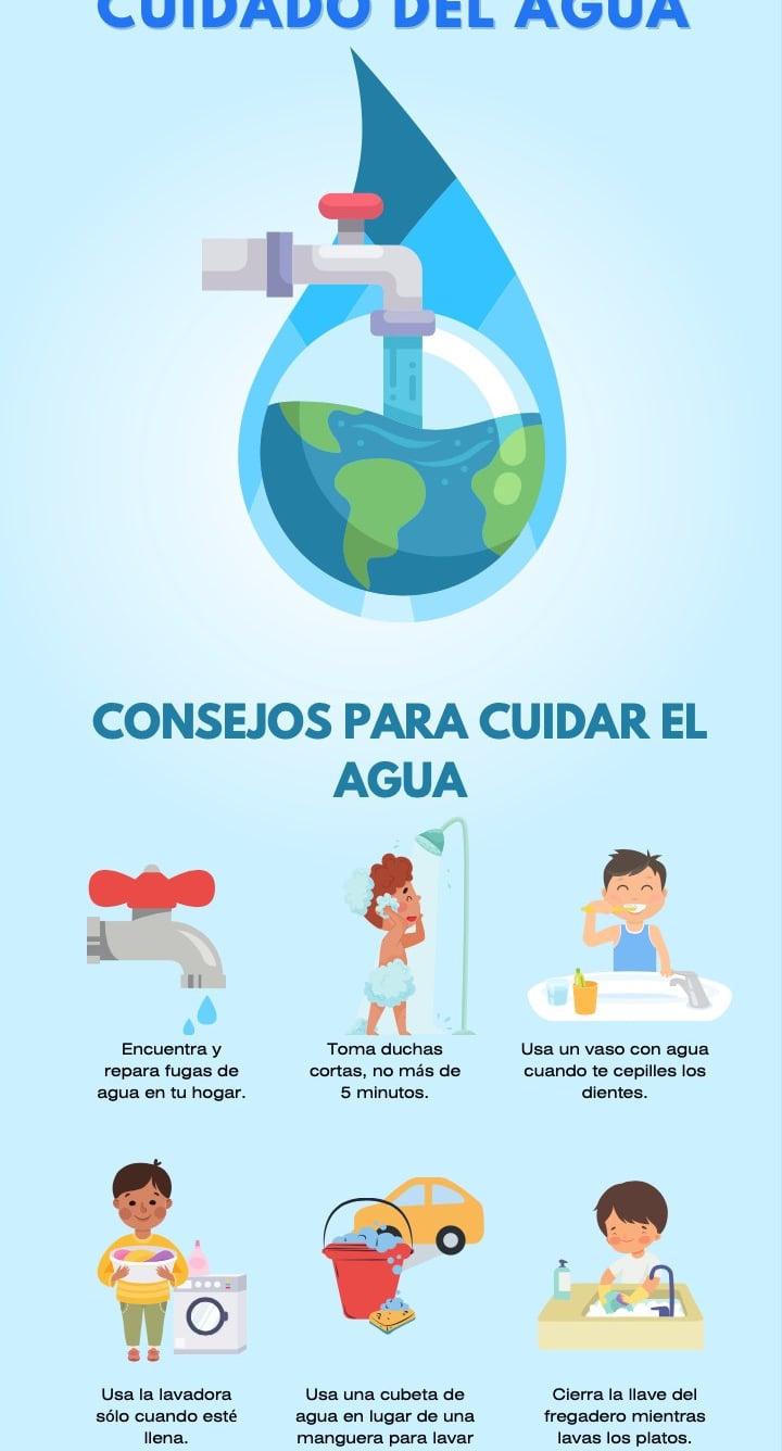 ¡Cuidemos el agua! Todos podemos marcar la diferencia. Aquí te compartimos algunos consejos para cuidar este vital líquido desde nuestros hogares: Reparar fugas: Asegúrate de que no haya fugas en grifos, cañerías o inodoros. Cerrar grifos correctamente: No dejar correr el agua innecesariamente al lavarse las manos o los platos. Recoger agua de lluvia: Utiliza recipientes para recolectar agua de lluvia y úsala para regar plantas. Optar por electrodomésticos eficientes: Elige electrodomésticos que sean eficientes en el uso del agua. Reutilizar agua: Puedes reutilizar el agua utilizada para cocinar o lavar verduras en tus plantas. Limitar duchas largas: Reduzcamos el tiempo en la ducha para conservar agua. ¡Pequeñas acciones suman para preservar este recurso esencial! 💧🌍