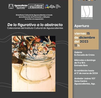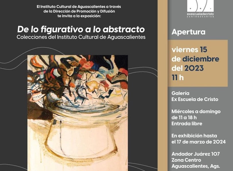 ¡Descubre la fascinante transformación del arte en la exposición "De lo Figurativo a lo Abstracto" en la Galería Ex Escuela de Cristo - Escuela Pía! 🎨 Fecha: Hasta el 17 de marzo de 2024. Explora las colecciones del Instituto Cultural de Aguascalientes y déjate llevar por el viaje artístico desde lo figurativo hasta lo abstracto. ¡No te pierdas esta experiencia única para apreciar la evolución del arte en #ElGiganteDeMéxico! #ViveICA #CapitalAmericanaDeLaCultura
