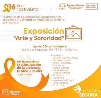 En el marco de los #16DíasDeActivismo, te invitamos cordialmente a la exposición "Arte y Sororidad", una celebración del poder y la solidaridad femenina a través del arte. Únete a nosotros mañana, jueves 30 de noviembre, de 8:30 a 16:00 horas, en la explanada del Instituto de Educación de Aguascalientes, donde podrás admirar una variedad de expresiones artísticas que reflejan la importancia de la sororidad en la lucha por la igualdad de género. No te pierdas esta oportunidad de sumergirte en un espacio inspirador y reflexivo. ¡Tu presencia es esencial! Juntos, podemos impulsar un cambio positivo en nuestra sociedad. ¡Nos vemos allí!