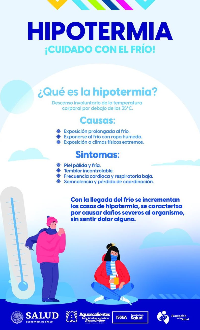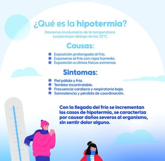 "Hipotermia: Causas, Síntomas y Prevención en Climas Fríos" La hipotermia se produce cuando el cuerpo pierde más calor de lo que puede producir, especialmente en climas fríos. ❄️ 🌡 Con la llegada del frío, aumenta el riesgo de casos de hipotermia. Aquí te compartimos más información: Causas: Exposición prolongada al frío. Ropa inadecuada para las condiciones climáticas. Inmersión en agua fría. Síntomas: Temblores. Confusión. Fatiga. Pérdida de coordinación. Prevención: Vestirse adecuadamente. Mantenerse seco. Evitar la exposición prolongada al frío. Si experimentas síntomas de hipotermia, busca ayuda médica de inmediato. ¡Prioriza tu salud en climas fríos! 🧤🧣