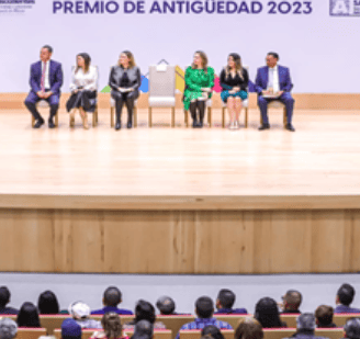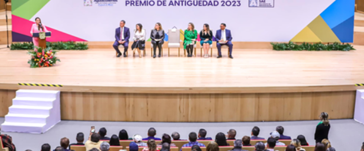 La gobernadora de Aguascalientes, Tere Jiménez, entregó reconocimientos a más de 500 servidores públicos del Gobierno del Estado que han trabajado durante 15, 20, 25, 30, 35 y 40 años. Los felicitó y los animó a seguir trabajando con pasión y entrega para beneficiar a la sociedad y hacer crecer al estado. La secretaria de Administración mencionó la importancia de la lealtad y dedicación en el servicio público, y agradeció a los homenajeados por su labor. Roberto Ortiz Hernández, quien recibió un reconocimiento por 40 años de servicio, agradeció en nombre de los servidores públicos. El evento contó con la presencia de otras autoridades.