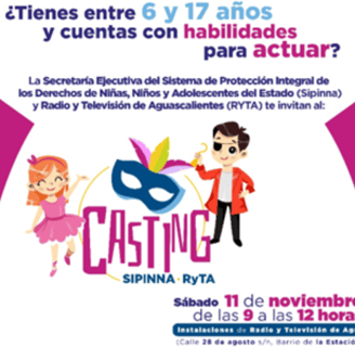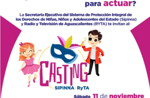 El Sistema de Protección Integral de los Derechos de Niñas, Niños y Adolescentes (Sipinna) junto con Radio y Televisión de Aguascalientes (RyTA), están organizando un casting para seleccionar niñas, niños y adolescentes entre 6 y 17 años que puedan actuar en una serie de cápsulas que serán grabadas por RyTA para difundir los derechos humanos de este grupo de la población. Los participantes deben tener habilidades para actuar y deberán asistir acompañados de un adulto con identificación oficial. Aquellos que sean seleccionados recibirán un reconocimiento y deberán tener disponibilidad de tiempo para las grabaciones. Es necesario que los padres o tutores firmen un Consentimiento Informado expedido por el Sipinna Estatal. Para más información, se pueden comunicar a los números proporcionados o acudir a las instalaciones del Sipinna estatal