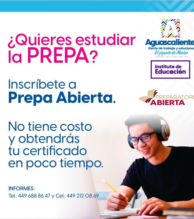 ¡No pierdas la oportunidad de continuar tu educación! La Prepa Abierta ofrece inscripciones durante todo el año, sin costo alguno y sin límite de edad para ingresar. Esta modalidad flexible se adapta a tu ritmo de vida, permitiéndote avanzar en tus estudios de bachillerato de manera accesible. Obtén más información y asegura tu lugar llamando a los números de informes: 📲 449 688 86 47 y 449 212 08 69. ¡Emprende tu camino educativo con la Prepa Abierta y abre nuevas puertas para tu futuro académico!