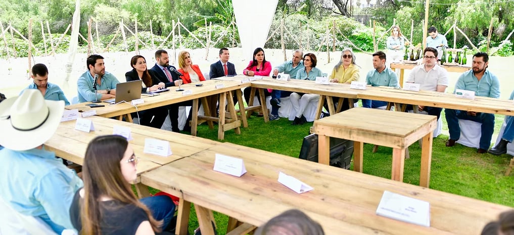 La gobernadora Tere Jiménez se reunió con vitivinicultores de Aguascalientes para conocer los avances y proyectos en los que están trabajando. Durante la Sesión Extraordinaria del Consejo Vitivinícola de Aguascalientes, que se celebró en la Vinícola BonArt, Tere Jiménez reafirmó su apoyo a esta industria, que es un orgullo para el estado. La gobernadora destacó que en Aguascalientes se produce vino de gran calidad, reconocido internacionalmente, y se comprometió a proporcionar todas las herramientas necesarias para que continúen elaborando productos de excelencia. "Somos parte de su equipo, y juntos lograremos que los vinos de Aguascalientes sean conocidos en todo el mundo", afirmó. Patricio Quesada, presidente del Consejo Vitivinícola de Aguascalientes, agradeció a la gobernadora por su apoyo y por su interés en que los vinos locales se den a conocer globalmente. Además, Tere Jiménez encabezó la inauguración del Café Wine Bar Roble Negro, un lugar donde los visitantes pueden disfrutar de catas, cenas o maridajes con alguna de las 120 etiquetas de vino hidrocálido disponibles. Los interesados en visitar el lugar pueden hacer reservaciones al Tel. 449 327 22 55. En el evento también participaron Esaú Garza de Vega, secretario de Desarrollo Económico, Ciencia y Tecnología, Andrea Chávez, directora del Fideicomiso Complejo Tres Centurias, rectores de universidades, y viticultores.