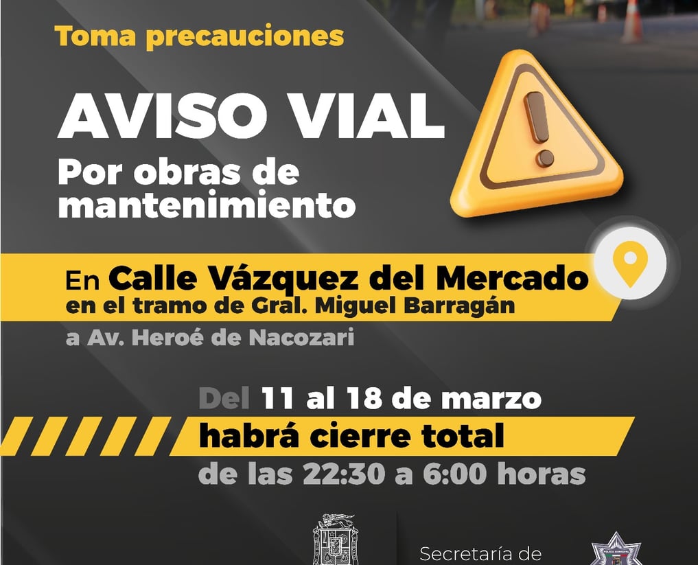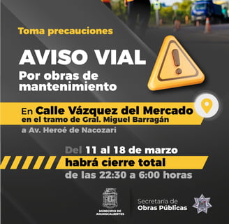 El Municipio de Aguascalientes ha anunciado que del 11 al 18 de marzo se llevarán a cabo cierres viales en la calle Vázquez del Mercado, en el tramo entre Barragán y Av. Héroe de Nacozari, en la Zona Centro. Estos cierres son necesarios para facilitar trabajos de rehabilitación de la carpeta asfáltica. Durante este período, se llevarán a cabo cierres totales de la vialidad desde las 22:30 hasta las 6:00 horas del día siguiente. Para minimizar las molestias, se recomienda a conductores y peatones tomar rutas alternas mientras duren las obras. Estos trabajos marcan la culminación de las intervenciones realizadas en las calles del Centro de la ciudad, demostrando el compromiso del Municipio por mantener y mejorar la infraestructura vial en beneficio de todos los ciudadanos.